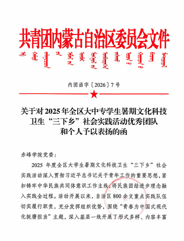 近日,共青团内蒙古自治区委员会发来表扬函,对我院副院长孙会艳指导的“京蒙医心筑梦队”在2025年全区大中专学生暑期文化科技卫生“三下乡”社会实践活动中表现突出,荣获“优秀团队”称号表示祝贺与感谢。